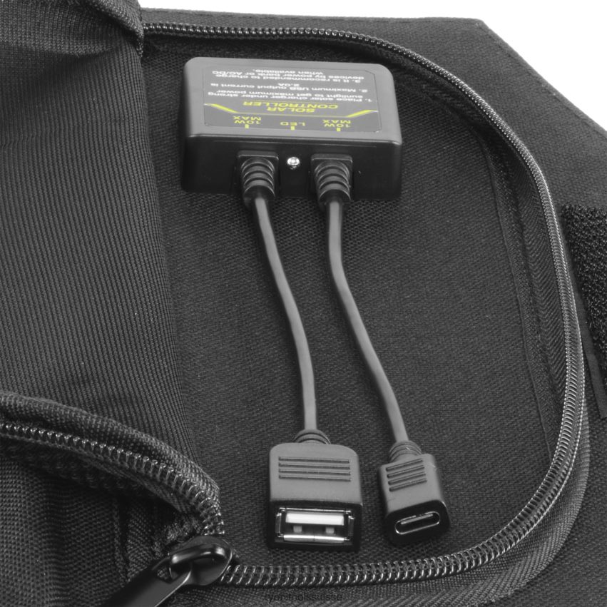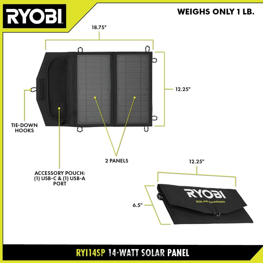 le panneau solaire pliable Ryobi de 14 watts alimente tout petit appareil électronique doté d’un port USB-A ou USB-C directement à partir du soleil. il est idéal pour alimenter vos téléphones, tablettes, banques d’alimentation, haut-parleurs et même vos batteries Ryobi 18 V One+ lorsqu’il est combiné avec une source d’alimentation Ryobi compatible. il peut charger une batterie Ryobi 18v one+ 2ah en moins de 4 heures et votre téléphone en aussi peu que 2 heures et 20 minutes. le panneau solaire de 14 watts maximise la portabilité de votre source d’alimentation, pesant seulement 1 livre et mesurant 12,15” x 6,5” une fois plié. la conception compacte, légère et pliable facilite le stockage et le transport, de sorte que vous pouvez l’emporter avec vous pour charger des appareils lors de la randonnée, du camping, à la plage et partout sous le soleil où vous auriez besoin d’une alimentation portable. ça peut être ouvertposé à plat sur le sol pour capturer la lumière pendant les heures de pointe d’ensoleillement, ou peut être suspendu à différents angles à l’aide des (7) boucles de suspension intégrées pour maximiser la quantité de lumière qu’il capture. le panneau solaire Ryobi de 14 watts bénéficie de la garantie fabricant Ryobi de 3 ans et comprend le panneau solaire pliable ryi14sp de 14 watts et un manuel d’utilisation.