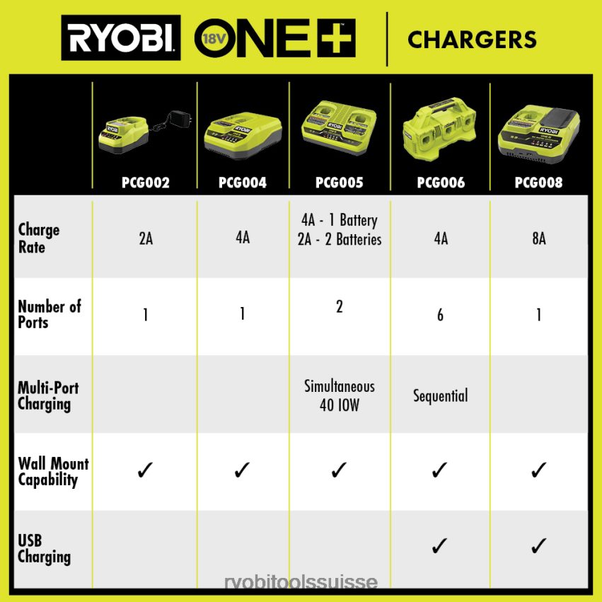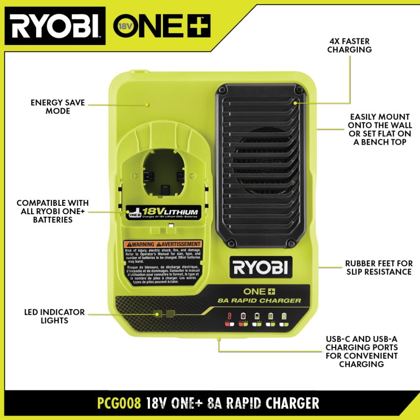 étendez votre système Ryobi 18v one+ avec le chargeur rapide Ryobi 18v one+ 8a. la charge a été rendue plus rapide que jamais. avec une charge 4 fois plus rapide que le pcg002, ce chargeur réduit considérablement les temps d’arrêt, permettant aux utilisateurs de charger une batterie au lithium haute performance de 8 Ah en moins d’une heure. doté de voyants LED, les utilisateurs peuvent facilement identifier l’état de charge de la batterie. les ports de chargement USB-C et USB-A permettent aux utilisateurs de charger facilement leurs appareils électroniques portables. les pieds en caoutchouc offrent une base antidérapante pour empêcher votre chargeur de glisser dans votre espace de travail. le mode d’économie d’énergie conserve l’énergie lorsque vous ne chargez pas ou n’entretenez pas les batteries. pour maximiser l’espace de travail, la capacité de montage mural garantit l’organisation à tout moment. Mieux encore, il fait partie du système Ryobi 18v One+ de plus de 280 CO.Des produits sans fil qui fonctionnent tous sur la même plateforme de batterie. ce chargeur rapide 18 V one+ 8 A bénéficie de la garantie fabricant Ryobi de 3 ans et comprend (1) chargeur rapide PCG008 18 V 8 A et un manuel d’utilisation. batterie vendue séparément.