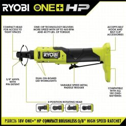 améliorez votre système Ryobi 18v one+ avec le cliquet compact sans balais 3/8” haute vitesse 18v one+ hp . La technologie one+ hp offre plus de puissance, d’autonomie, de durabilité et de vitesse grâce à des moteurs sans balais, une électronique avancée et une technologie au lithium haute performance. nos outils compacts sont les plus légers et les plus petits que nous ayons jamais fabriqués, tout en offrant une puissance optimale pour accomplir le travail. Idéal pour tout passionné d’automobile ou technicien professionnel, ce cliquet est capable d’une vitesse 2 fois plus élevée, offrant jusqu’à 460 tr/min. Associez-le à 40 pieds-livres. de couple, cet outil devient le gain de temps ultime lors de l’exécution de tâches répétitives, conduisant à une réalisation plus rapide du projet. doté d’une tête à cliquet rotative à 4 positions 20 % plus compacte avec double LED intégréeLampes de travail, ce cliquet peut atteindre n’importe quel écrou ou boulon dans un espace de travail éclairé. la gâchette à palette métallique à vitesse variable est facilement accessible sous une variété de poignées et d’angles. ce cliquet compact sans balais 18 V one+ hp 3/8″ haute vitesse est couvert par la garantie du fabricant Ryobi de 3 ans et comprend (1) psbrc26 18 V compact sans balais 3/8″ haute vitesse et un manuel d’utilisation. Mieux encore, il fait partie du système Ryobi 18v one+ composé de plus de 260 produits sans fil qui fonctionnent tous sur la même plate-forme de batterie. Batterie 2 Ah et chargeur inclus.