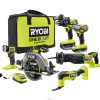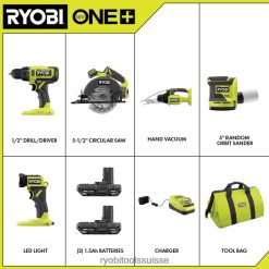 entrez dans le système 18v one+ de Ryobi avec le kit combiné 18v one+ hp sans balais à 5 outils – 1/2″ perceuse/visseuse, visseuse à percussion 1/4″, scie circulaire 7-1/4″, outil multifonction, lumière LED, batterie haute performance 18v one+ 4ah lithium-ion, batterie haute performance 18v one+ 2ah lithium-ion, chargeur et outil La technologie one+ hp offre plus de puissance, d’autonomie, de durabilité et de vitesse grâce à des moteurs sans balais, une électronique avancée et une technologie au lithium haute performance. La perceuse/visseuse de 1/2″ offre un perçage jusqu’à 20 % plus rapide et jusqu’à 50 % de couple en plus. gain de temps et d’énergie par application. le tournevis à percussion de 1/4″ offre une conduite jusqu’à 25 % plus rapide et un couple de 2 220 po-lb, fournissant à cet outil la puissance nécessaire pour conduire longtempsr attaches à travers des matériaux résistants. la scie circulaire de 7-1/4″ offre une coupe jusqu’à 40 % plus rapide et plus de 325 coupes par charge. l’outil multifonction dispose d’un angle d’oscillation agressif de 3,6 degrés offrant des vitesses de coupe jusqu’à 30 % plus rapides avec un cadran de vitesse réglable, qui fonctionne jusqu’à 20 000 opm. la lumière LED a 280 lumens de puissance lumineuse et une tête pivotante à 130 degrés pour une direction du faisceau lumineux réglable. les batteries 18 V One+ 4 Ah et 2 Ah haute performance offrent jusqu’à 30 % de puissance en plus que le lithium standard et disposent d’un jauge de carburant haute visibilité pour surveiller l’autonomie restante. couvert par la garantie fabricant Ryobi de 3 ans.