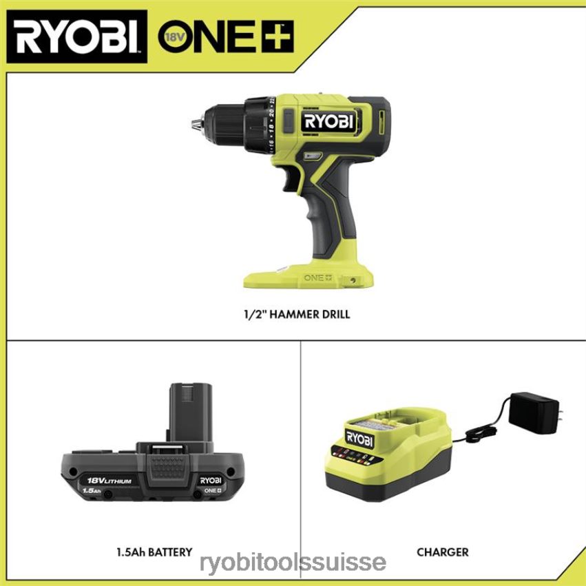 ryobi présente le kit de perceuse à percussion sans fil 18 V one+ de 1/2 po avec (1) batterie et chargeur de 1,5 Ah. ce marteau perforateur est doté d’un moteur puissant qui fournit jusqu’à 515 po/lb. de couple et permet un perçage rapide à travers le béton et la maçonnerie jusqu’à 28 000 bpm. Doté d’un mandrin métallique à cliquet sans clé, la durabilité et la résistance accrue sont garanties. la boîte de vitesses à 2 vitesses et l’embrayage à 24 positions avec mode marteau vous permettent d’ajuster le couple de sortie pour contrôler la profondeur de la vis ou de la fixation. la lampe de travail LED intégrée crée une visibilité supplémentaire pour tous vos projets. la batterie et le chargeur inclus sont compatibles avec tous les outils Ryobi 18 V. ce kit de perceuse à percussion sans fil 18 V One+ de 1/2 po est couvert par la garantie du fabricant Ryobi de 3 ans et comprend (1) batterie de 1,5 Ah, un chargeur 18 V et un opéramanuels du tor.