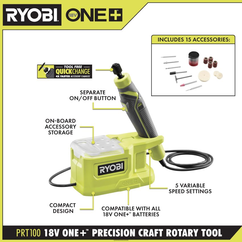 étendez votre système d’outils Ryobi 18v one+ avec l’outil rotatif de précision prt100. la commodité sans fil de cet outil rotatif de précision permet à l’utilisateur de se déplacer là où se trouve son prochain projet plutôt que de se soucier de l’endroit où trouver la prise et la rallonge les plus proches. Les 5 réglages de vitesse variable de l’outil rotatif de précision offrent aux utilisateurs un contrôle et une précision maximum avec des performances améliorées. cet outil rotatif est également équipé de la nouvelle pince à changement rapide innovante avec des changements d’accessoires 4 fois plus rapides, ce qui rend le changement d’accessoires rapide et facile. les 12 accessoires inclus offrent la possibilité de réaliser une grande variété d’applications de précision et légères telles que la gravure sur métal, la sculpture complexe sur bois, la gravure sur verre, le polissage et d’autres projets d’artisanat. le sur-Le rangement du compartiment pour accessoires de planche offre un moyen pratique de rester organisé et de garder vos accessoires à proximité pour plus de commodité. la batterie et le chargeur inclus sont compatibles avec tous les outils Ryobi 18v one+. Bénéficiant de la garantie fabricant Ryobi de 3 ans, l’outil rotatif de précision comprend 12 accessoires de gravure, de sculpture, de ponçage, de polissage et de nettoyage, ainsi qu’un manuel d’utilisation.