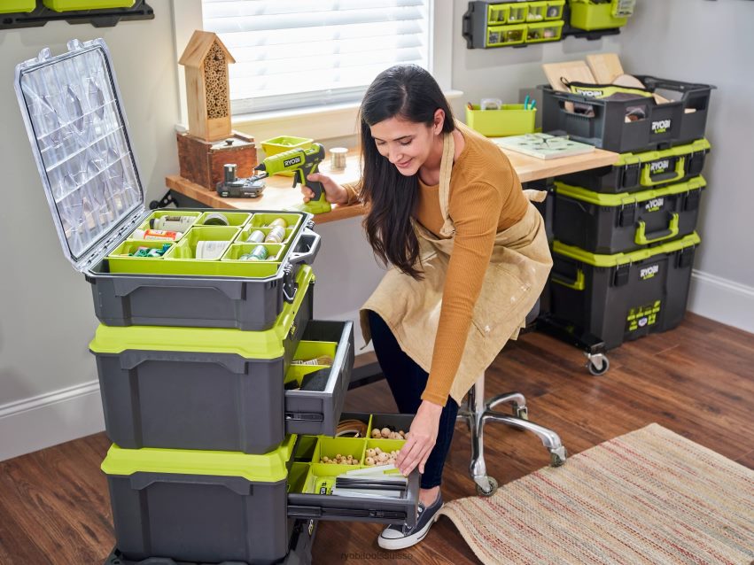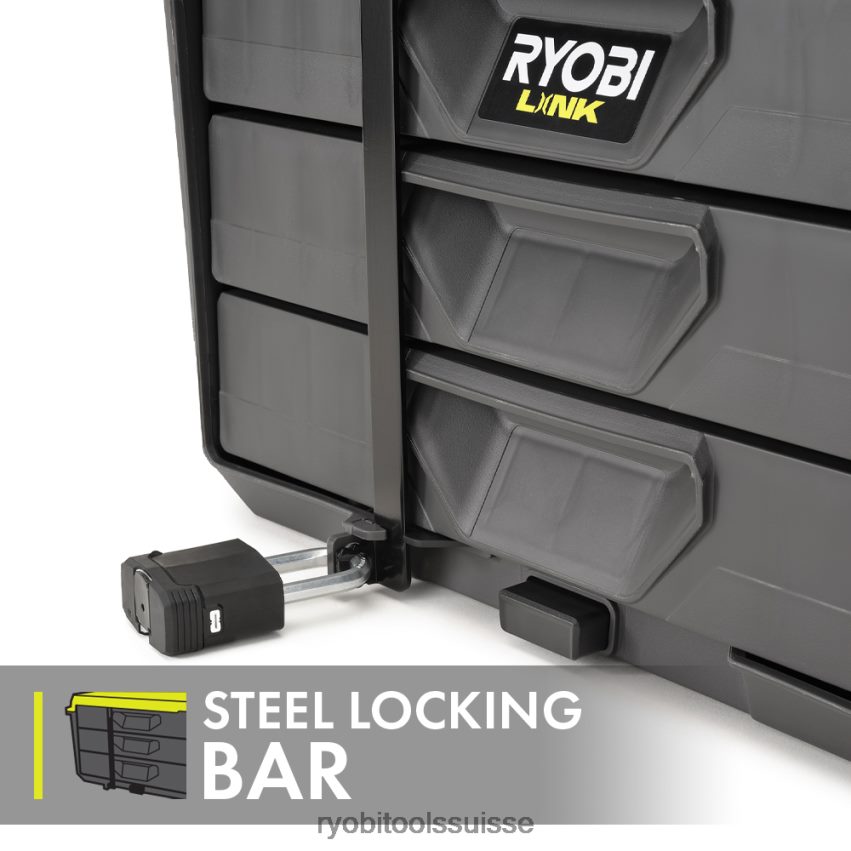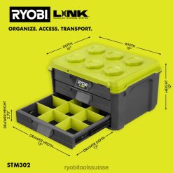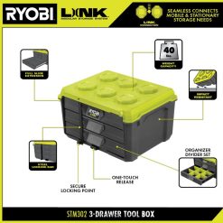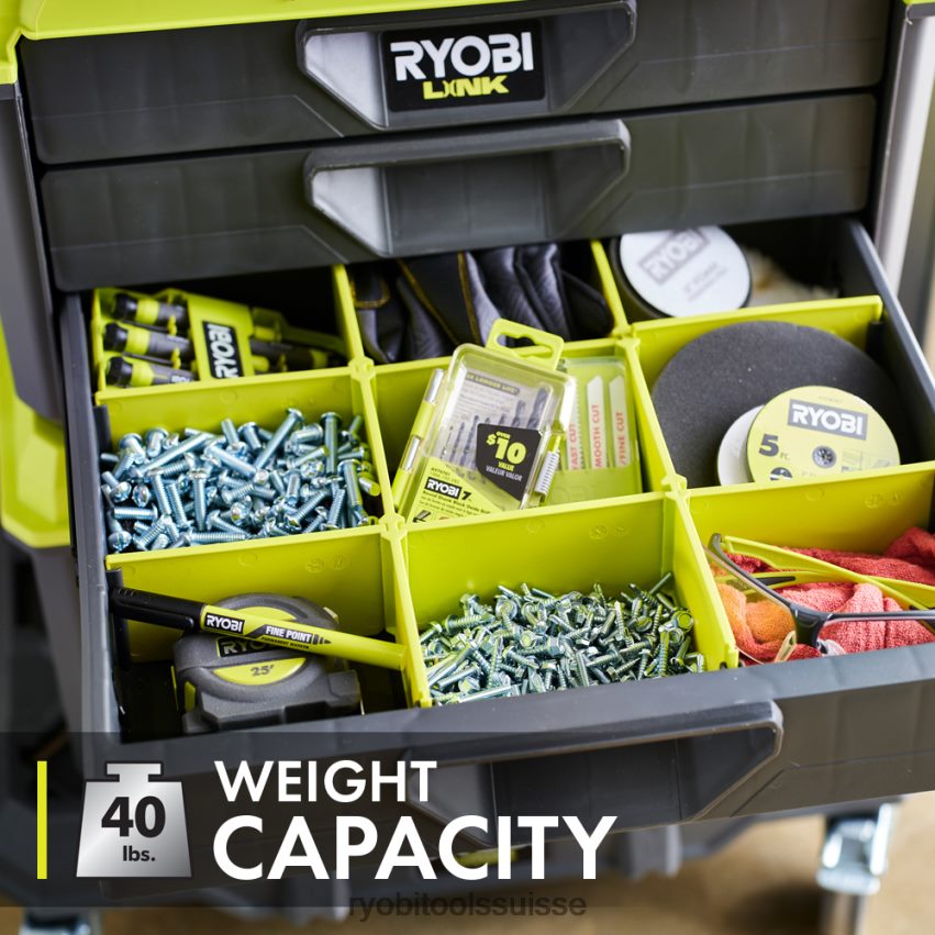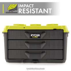 le système de stockage modulaire Ryobi Link révolutionne l’industrie du stockage, vous permettant d’organiser, d’accéder et de transporter votre vie. la boîte à outils Ryobi Link à 3 tiroirs permet de ranger les outils dans les situations les plus difficiles. équipé d’un matériau résistant aux chocs et d’une capacité de charge de 40 lb. Sécurisez facilement le rangement de vos outils portables grâce à la barre de verrouillage en acier escamotable et au point de verrouillage sécurisé. les glissières à extension complète offrent un fonctionnement fluide tandis que l’ensemble de séparateurs d’organisation inclus offre une organisation maximale de stockage des outils Ryobi, gardant les petites pièces à leur place. S’empilent de manière transparente sur n’importe quel élément de stockage mobile Ryobi Link. c’est le complément parfait à votre gamme de boîtes à outils mobiles. Mieux encore, il fait partie de la gamme de produits du système de stockage modulaire Ryobi Link qui utilise le même niveau de stockage.Technologie de stockage pour connecter de manière transparente vos besoins de stockage mobiles et fixes. Possédez votre espace avec le système de stockage modulaire Ryobi Link.