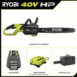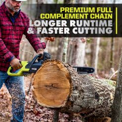 entrez dans le système Ryobi 40 V avec le kit de tronçonneuse sans balais de 20 pouces de 40 V HP. La technologie 40 V HP fournit plus de puissance qu’une tronçonneuse à essence de 50 cc, faisant de cette tronçonneuse un véritable remplacement au gaz. Cette tronçonneuse permet plus de 100 coupes par charge et est équipée d’une chaîne complète haut de gamme. La technologie 40 V combine un moteur sans balais, une électronique avancée et une technologie au lithium haute performance pour fournir plus de puissance, une durée de fonctionnement plus longue, une coupe plus rapide et une plus grande durabilité. “Le guide-chaîne et la chaîne coupent jusqu’à 36”, ce qui la rend idéale pour l’abattage, le tronçonnage et l’ébranchage. Cette tronçonneuse est dotée d’un graisseur automatique pour maintenir la chaîne lubrifiée pour une durée de vie plus longue et d’un frein de chaîne mécanique supplémentaire pour la protection contre le rebond. votre chaîne pour des coupes contrôlées et nettes à l’aide du chai à outilsn mise en tension avec rangement d’outils embarqué. Mieux encore, elle fait partie du système Ryobi 40 V où n’importe quelle batterie 40 V fonctionne avec n’importe quel produit 40 V. ce kit de tronçonneuse sans balais 40 V HP de 20 pouces est couvert par la garantie du fabricant sur les outils Ryobi de 5 ans, la garantie de la batterie du fabricant de 3 ans et comprend une tronçonneuse ry405011 de 20 pouces sans balais de 40 V HP, une batterie au lithium op4080a 40 V 8 Ah, un chargeur rapide OP406a 40 V, fourreau, clé mixte, étui de transport et manuels d’utilisation.