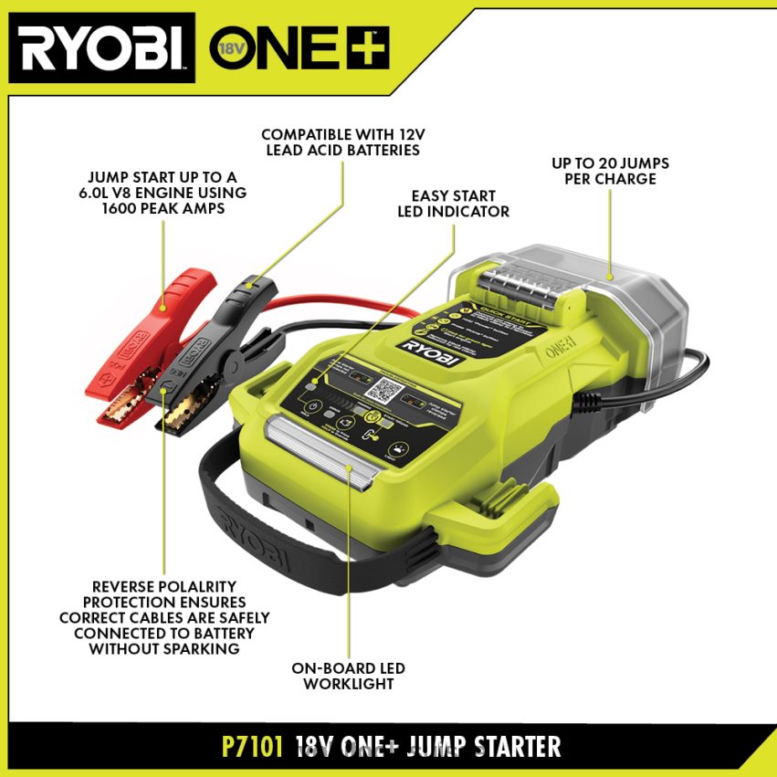 étendez votre système ryobi one+ avec le kit de démarrage ryobi 18v one+, le premier démarreur de saut de l’industrie dans un système sans fil. utilisez n’importe laquelle de vos batteries Ryobi 18 V One+ pour démarrer votre voiture – jusqu’à 20 fois en utilisant uniquement la batterie 2 Ah incluse. tout ce dont vous avez besoin est le démarreur et une batterie 18 V One+, aucun deuxième véhicule n’est nécessaire. cette unité est capable de démarrer jusqu’à un moteur V8 de 6,0 L avec 1 600 ampères de crête et peut fonctionner à des températures aussi basses que -4 degrés avec 800 ampères de démarrage à froid. conçu dans un souci de sécurité, le démarreur est doté d’une technologie anti-étincelles et d’une protection contre l’inversion de polarité pour garantir que les câbles sont connectés en toute sécurité à la batterie. En utilisant le guide de démarrage rapide intégré avec des instructions étape par étape, vous pouvez démarrer votre voiture en aussi peu que 60 secondes. l’unité dispose également d’unLampe de travail à LED pour une visibilité accrue en bordure de route et dans des situations de faible luminosité. Mieux encore, elle fait partie du système Ryobi One+ : n’importe quelle batterie 18 V One+ fonctionne avec n’importe quel produit 18 V One+. le démarreur et la batterie incluse bénéficient d’une garantie fabricant de 3 ans. ce kit comprend le démarreur p7101 1600 Peak Amp 18 V One+, la batterie au lithium pbp006 18 V 2 Ah, le chargeur PCG002 18 V et les manuels d’utilisation.