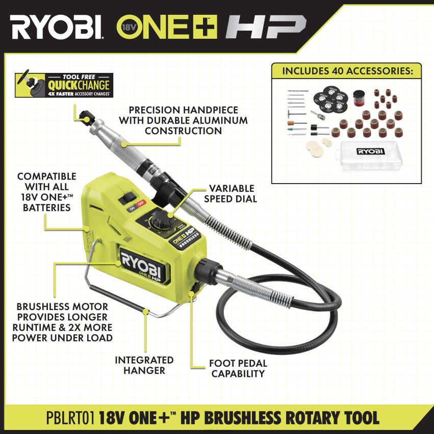 ryobi présente l’outil rotatif sans fil one+ hp 18v. l’outil rotatif one+ hp est conçu pour répondre aux attentes des professionnels, offrant une solution puissante avec une durée de fonctionnement plus longue et 2 fois plus de puissance sous charge. le cadran de vitesse variable permet aux utilisateurs de choisir entre 1 000 tr/min nominal jusqu’à 25 000 tr/min nominal, contribuant ainsi à garantir une précision et une exactitude maximales pour toutes les applications. la pièce à main de précision utilise une construction en aluminium de haute qualité et est dotée de la nouvelle pince à changement rapide innovante avec des changements d’accessoires 4 fois plus rapides, ce qui rend le changement d’accessoires rapide et facile. cet outil est également compatible avec les pédales, offrant une précision et un contrôle inégalés. Bénéficiant de la garantie fabricant Ryobi de 3 ans, cet outil rotatif comprend un 3Arbre flexible de 6 po, 40 accessoires de meulage/coupe/ponçage/polissage, un étui de rangement pour accessoires, une clé et un manuel d’utilisation. batterie et chargeur vendus séparément.